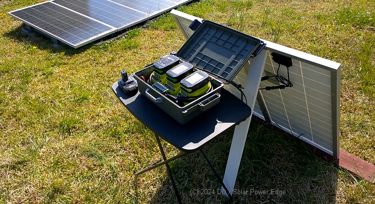 It is not the first time I have used direct DC solar power to charge power tool batteries. In 2022 I initiated the Solar Powered Ryobi 18v Battery charger project (see photos on this page, build videos are also linked toward the bottom of the article).