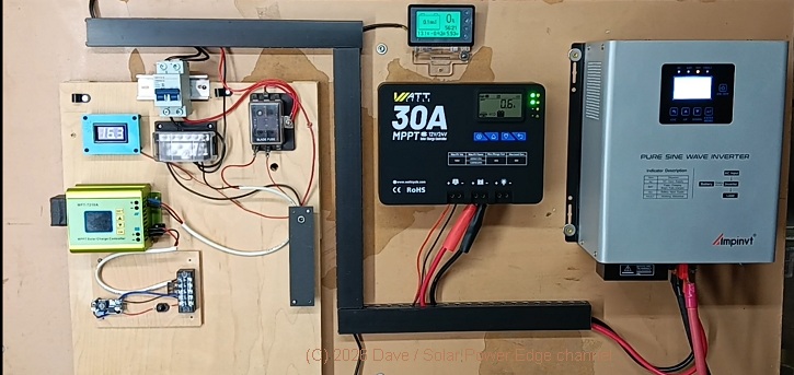 Somehow I managed to get a very heavy scrap board on the wall, alone and un-aided. Honestly that board was very heavy! Too heavy. I still remember fighting to hold it on the wall, get it level, and fasten it down. Then I chose and mounted a WattCycle 30a MPPT charge controller (I reviewed it earlier – on my YouTube channel). The inverter was mounted right besides and cables connected. Did I mention the inverter is heavy because it has a transformer inside? Yep. I took my MPT-7210a charging setup I used at the last property out of the shed and installed it on the board to share / re-use components, such as the PV circuit breaker.
